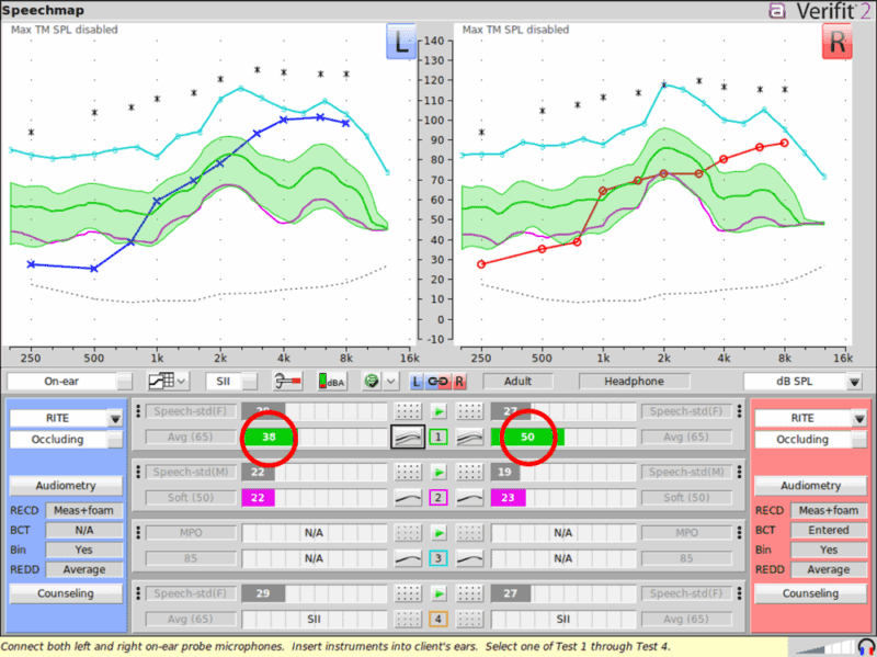 Performed Speech Mapping with VeriFit 2: As seen in Figure 5 we obtained much better aided audibility scores. The aided SII is now 57 in the left ear and 68 in the right ear.