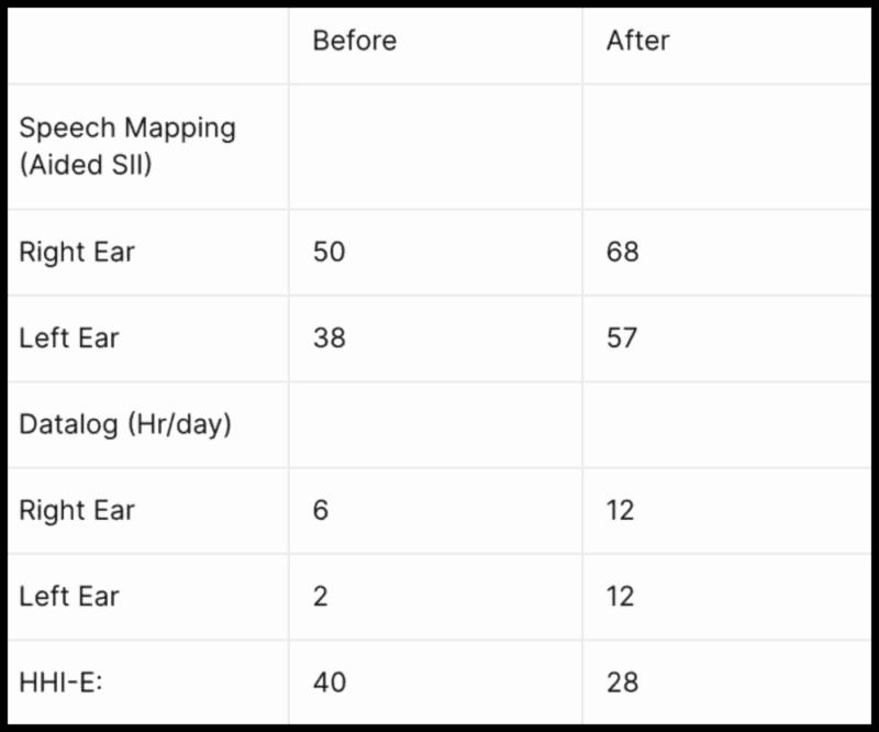On the patient’s post optimization HHI-E, the scores showed a twelve-point improvement/reduction in self-reported hearing challenges (from 40 down to 28).