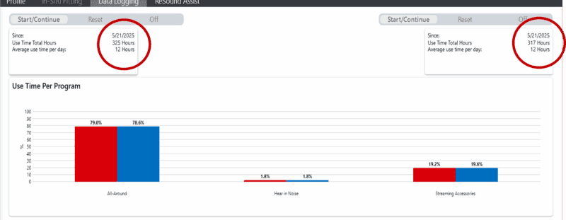That approach would be acceptable if the patient was raving about their performance but since the patient was stating the exact opposite, generic settings were inadequate. Most telling was the usage time (or lack their of), as seen in Figure 4: 6 hours a day for the right device and 2 hours a day for the left device. No one will reach peak performance with their hearing aids without a full-time commitment to utilization.