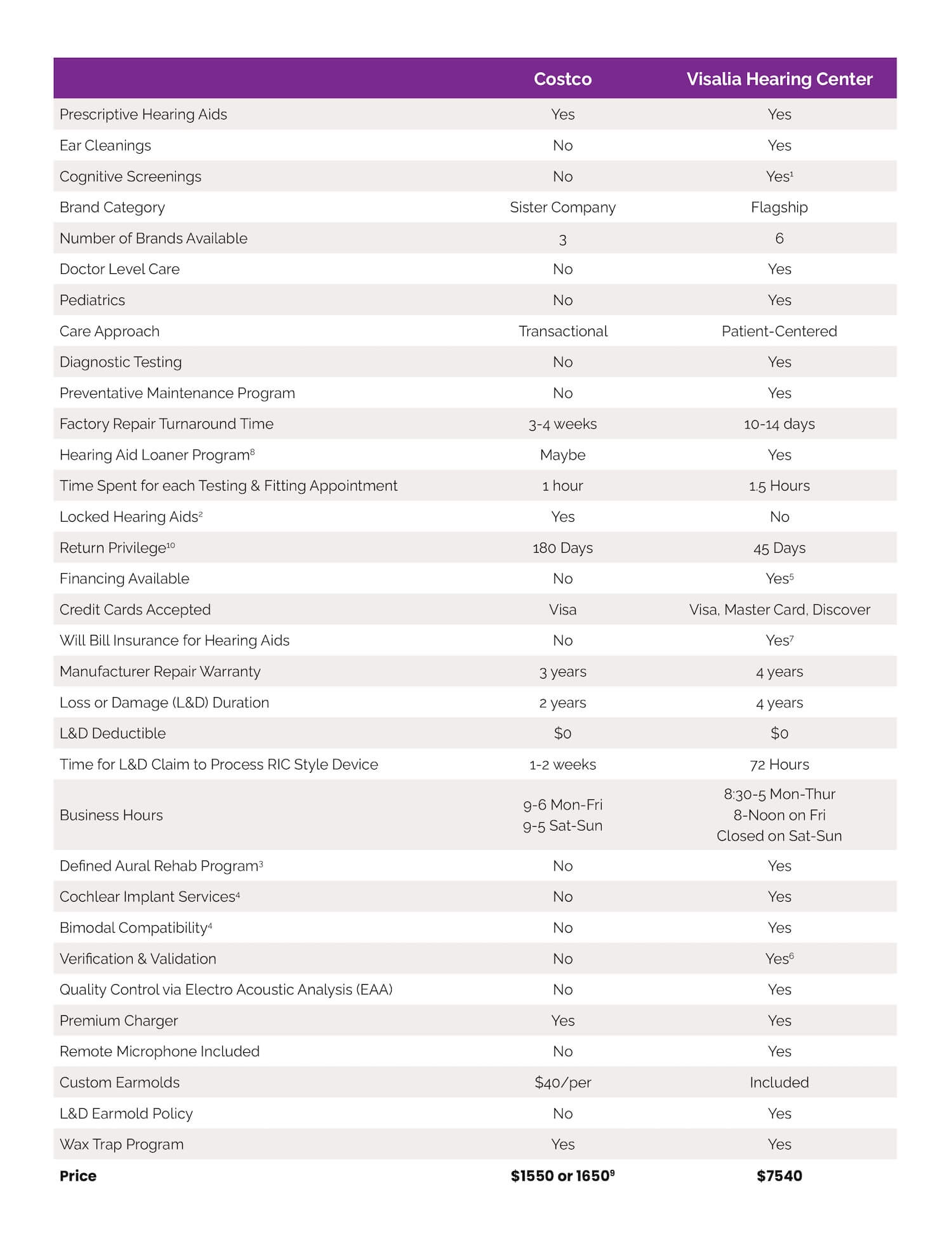 Based off our side-by-side comparison, there are definite areas where Costco has some advantages relative to what Visalia Hearing Center offers: