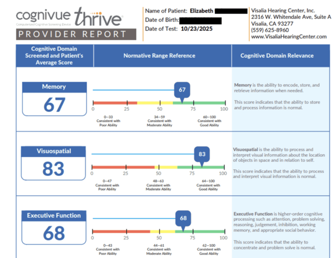 When Elizabeth joined us, she enrolled in our bundled care package, which includes so much more than just fitting new devices. One of the standout features of our bundled care package is annual cognitive screenings with the Cognivue.
