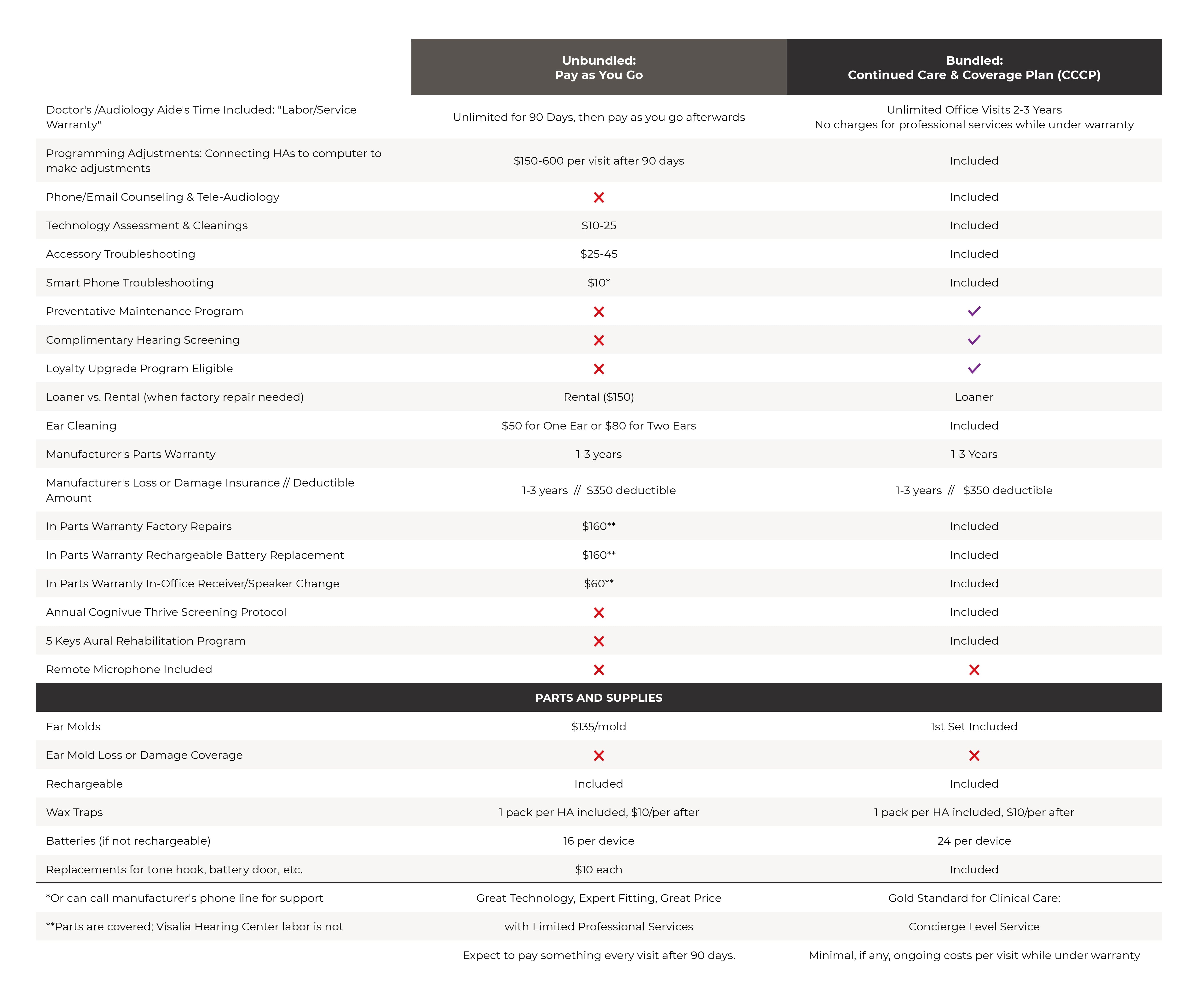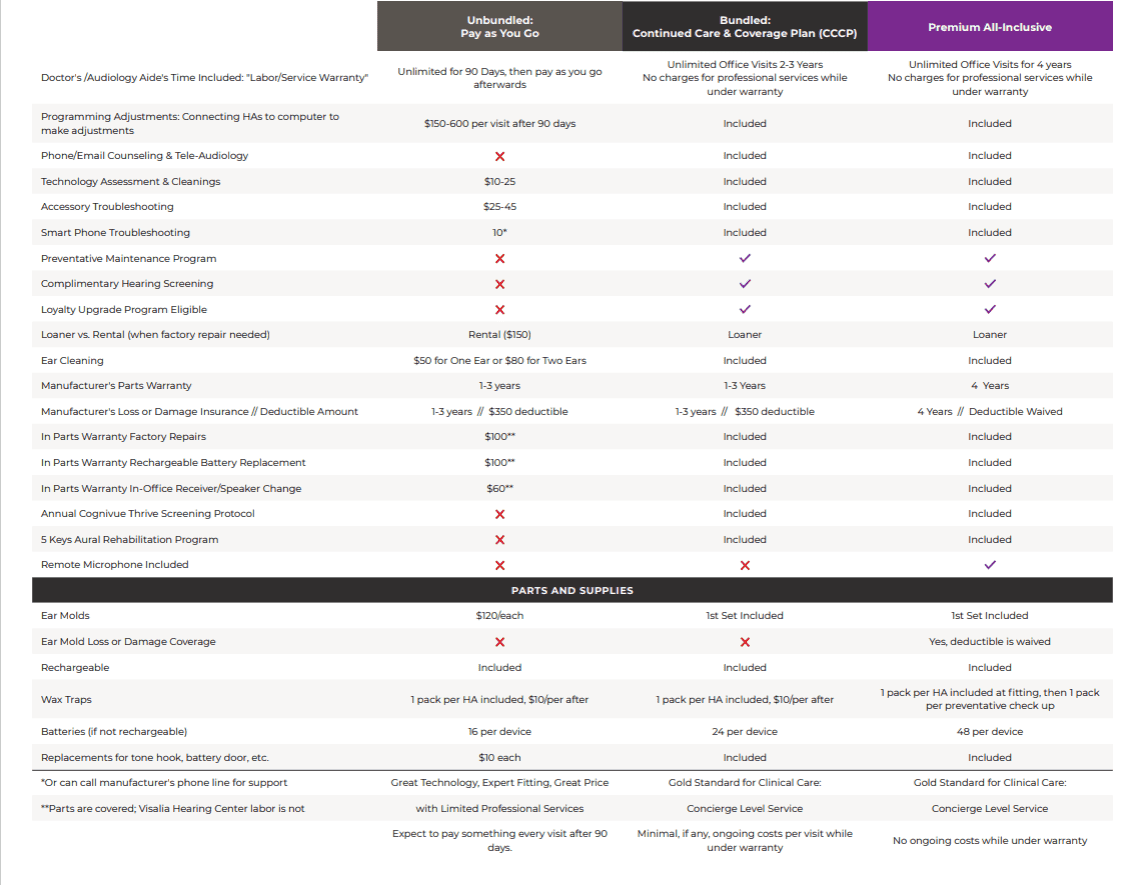 B) Service/warranty/care package: Think of this as how much of Visalia Hearing Center's time/professional services are included. More services included & a longer warranty period means you pay more than a package with less services and warranty included.